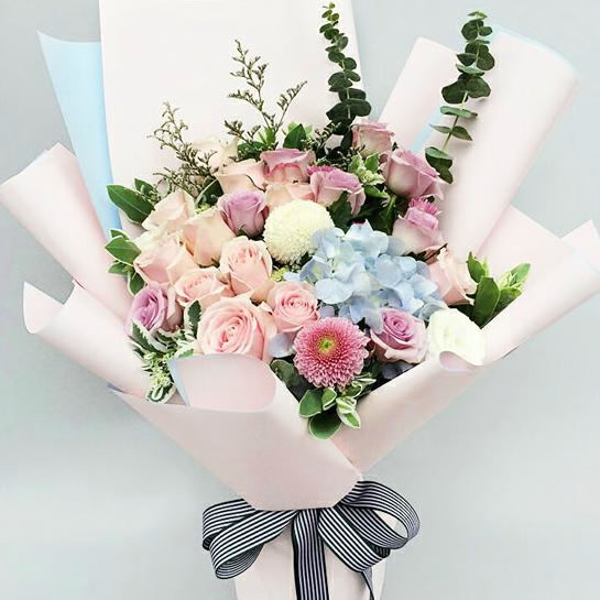 12只粉佳人玫瑰,6只紫玫瑰,3只紫色小菊,情人草,尤加利,高山积雪,绣球,你的轻柔像阵微风,让我从容不迫,想让你知道,我对你始终一往情深